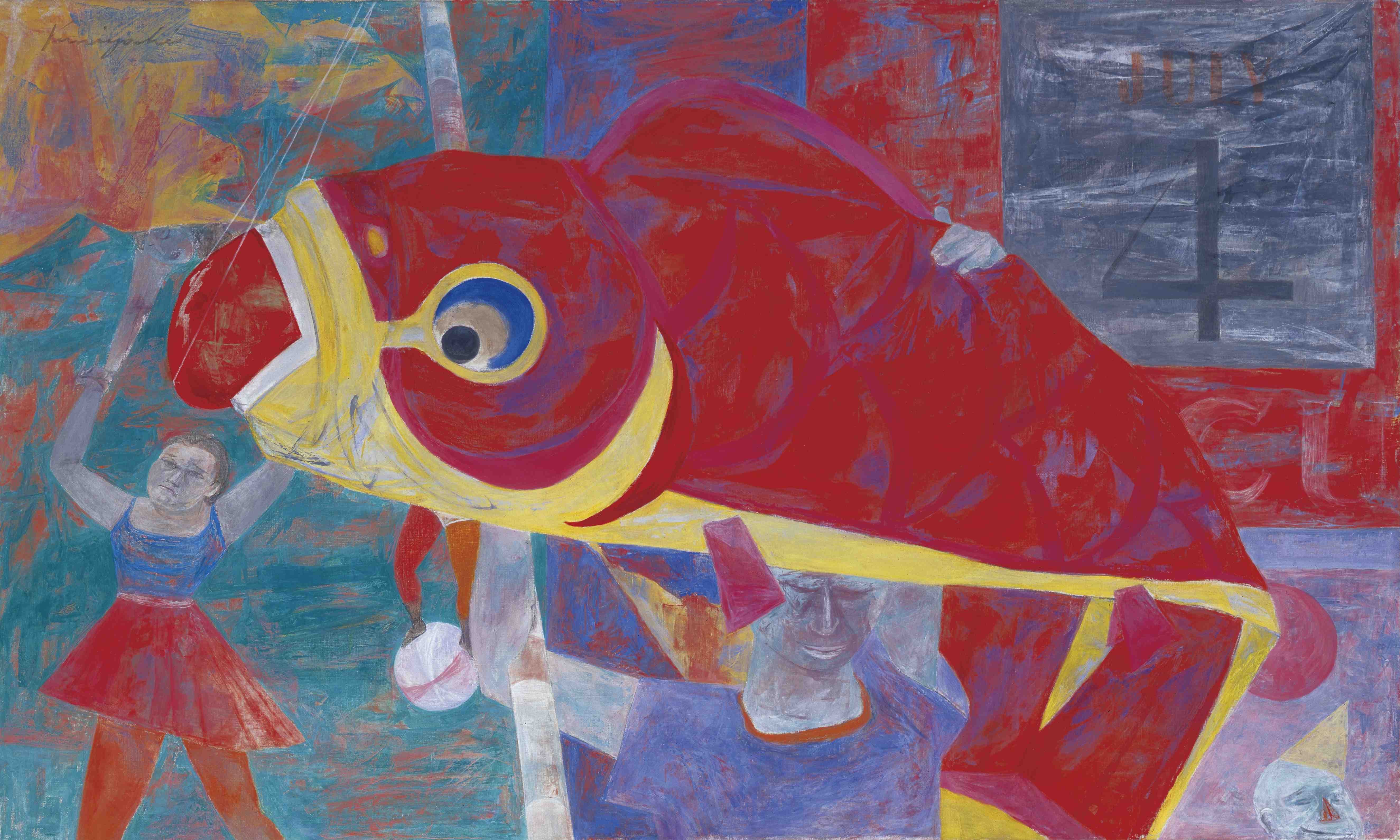 アメリカの象徴といわれるファンファーレが、アーロン・コープランド(1900ー1990)が作曲した「市民のためのファンファーレ」です。この曲は、第二次大戦終戦間近に作曲され、戦意高揚という役割を担っていました。アメリカ音楽の古典で、アメリカ人にとっては特別な曲です。1930年代半ばから国吉は、ナチスを追われた芸術家を受け入れる活動もしています。制作では「祭りが終わった」という大作を2年かけて描きました。この作品には国吉の下記のメッセージが添えられました。