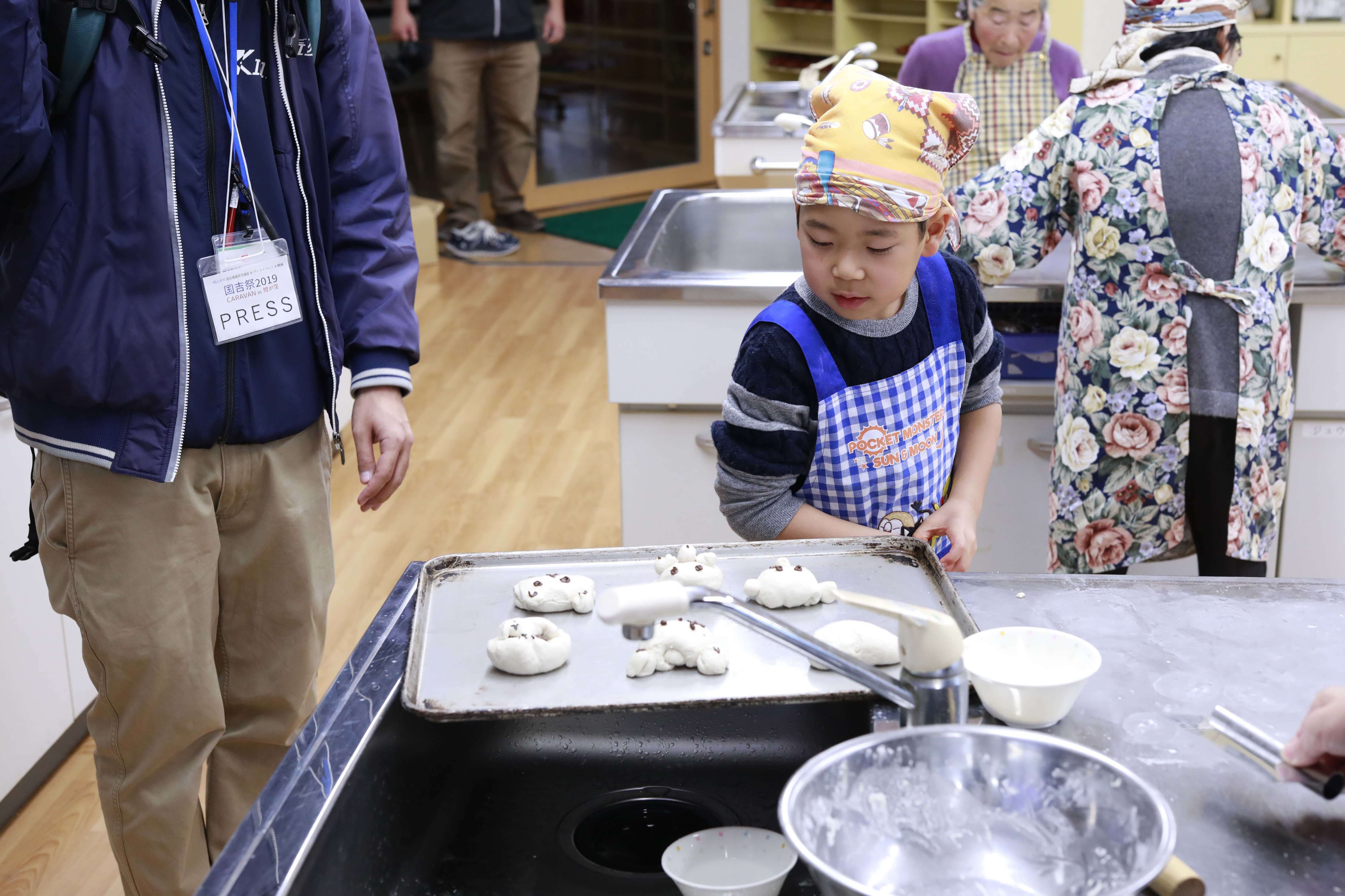 哲西町は、地域で収穫した米を、特殊な機械で微細粒粉にし、米粉パンの製造と販売に力を入れています。地域の小中学校の給食でも使用され、地産地消を実現しています。国吉康雄研究講座は、パンの製造工程である、捏ね、発酵、成形、焼成を、専門家の科学的な説明を受けながら作るプログラムを企画しました。パン作りは、鯉が窪道の駅でパン屋を営んでいる「こめ工房」様に協力いただき、粉の状態から5時間をかけてパンを作りました。
