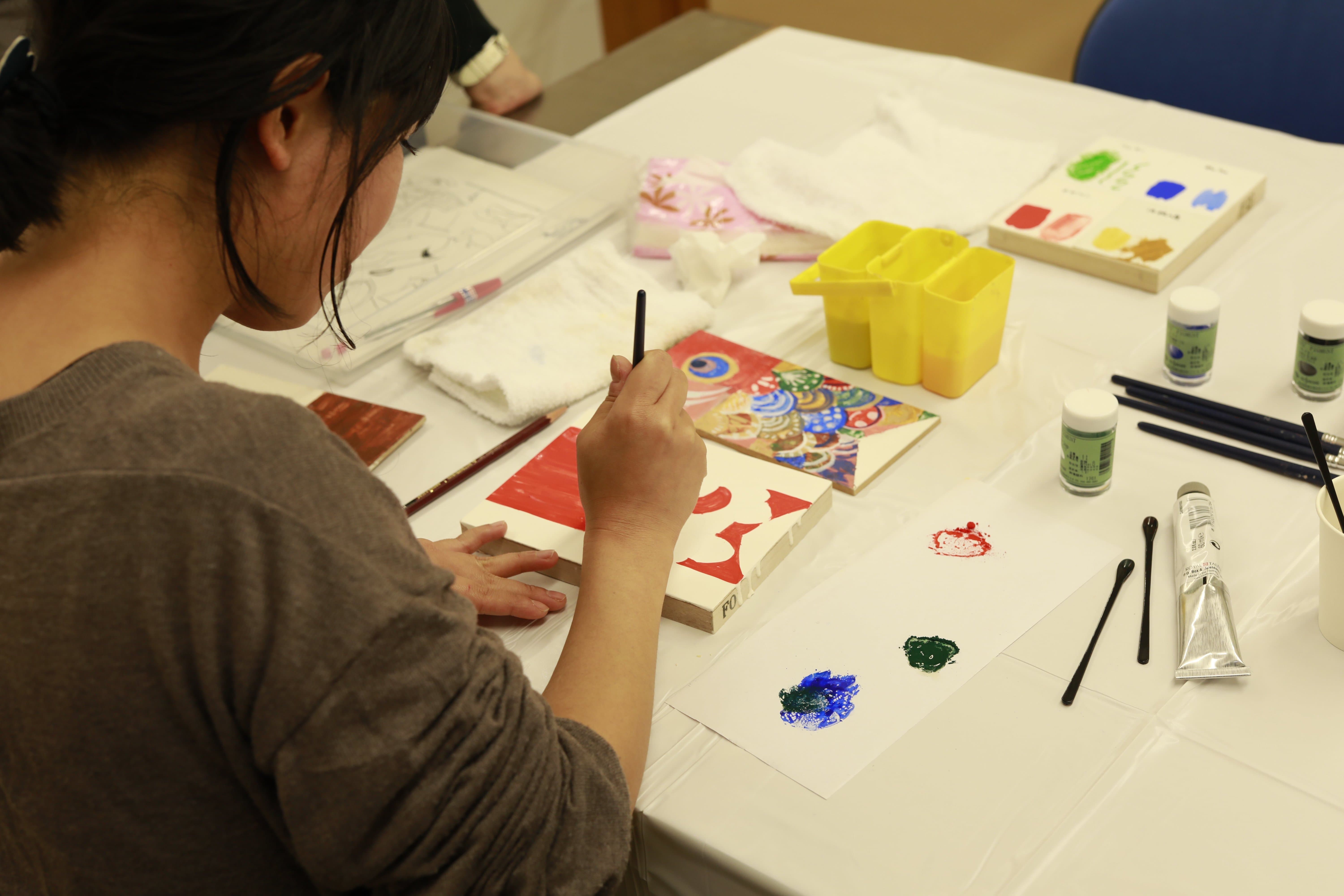 ミスターエース展で行ったカゼイン絵の具ワークショップをベースに、初めて体験する参加者が多かったため、カゼイン絵の具で制作する時間を延ばし実施しました。参加者の中には、岡山市からの親子がいるなど、このワークショップの人気が伺えました。参加者:子ども32名/大人(子どもの付き添いを含む)43名