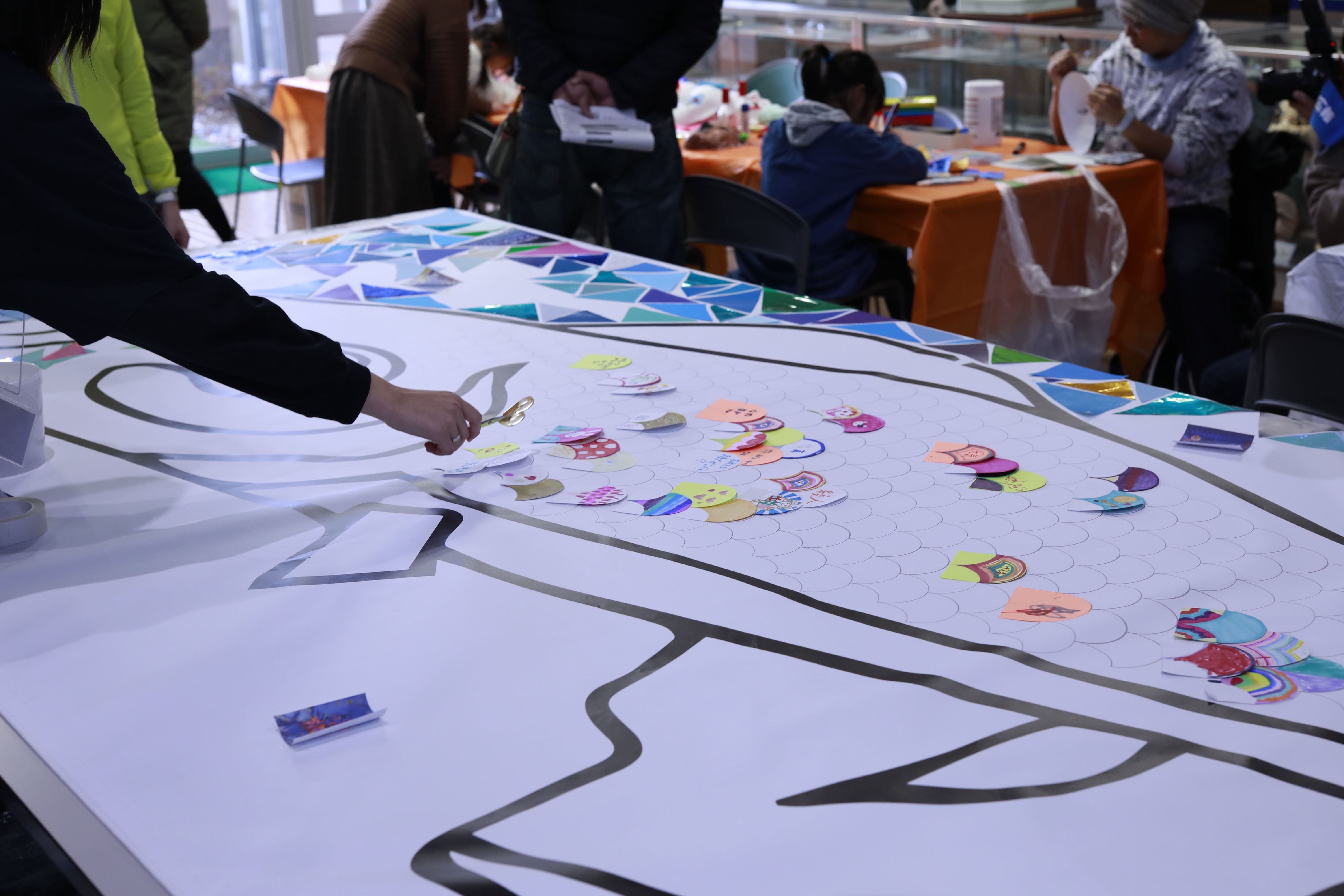 国吉作品に登場する動物や人物をスノードーム内に配置するワークショップです。国吉作品のモチーフの印象を、国吉作品と比較させることを目的に考案されました。12月の開催てあったこともあり、スノードームの土台を、クリスマスでプレゼントを入れるような大きな靴下にし、参加者は、学生スタッフが準備した、国吉作品をモチーフとしたキャラクターに色を塗り、スノードームを完成させました。