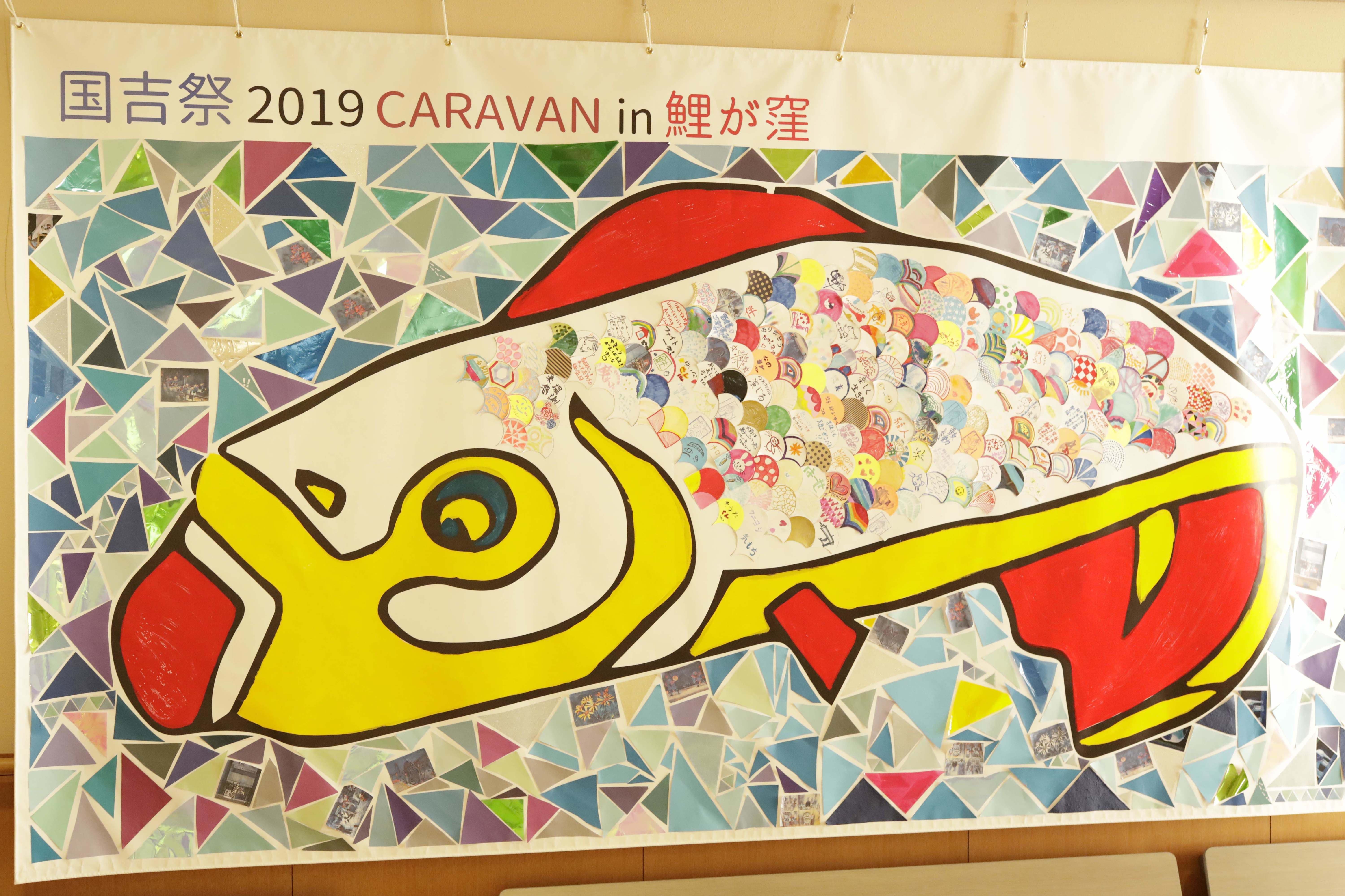 「国吉祭2019CARAVAN in鯉が窪」企画のきっかけであり、鯉が窪の地名の由来、そして観光資源である「鯉のぼり」を、参加者で作るワークショップでした。国吉が描いた鯉の線画を、高さ2m×横幅3.5mの塩化ビニルに印刷し、国吉祭参加者と学生が一緒に壁画の制作に取り組みました。参加者は「鯉」に、色紙で作った鱗を貼りつけ、七夕の短冊のように、自分の好きな言葉、感想などを書きました。鯉のまわりには、鯉が窪地区の祭事である「頭打ち」や、伝統芸能である「神代神楽」の写真を加工したものを貼り付け、国吉が描いた鯉が、鯉が窪を泳いでいるような壁画を制作。この壁画は、現在も、きらめき広場哲西に展示されています。