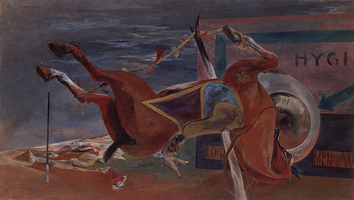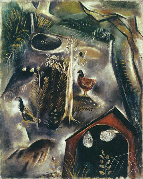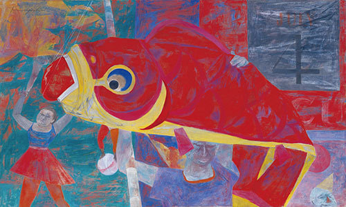 1930年代の後半以降、《祭りは終わった》に見られるように、国吉は独自のシンボリズムを使った作品を描き、タイトルには哲学的な要素が見られるようになります。戦後、独特の深い背景色に浮かぶのは、憂いを帯びた女性像ではなく、争う犬や昆虫。そして廃墟です。他にも、アメリカ合衆国の独立記念日である「July 4(7月4日)」や「矢印」など、何かを暗示する記号が増えるのですが、《安眠を妨げる夢》のように、空間として曖昧で歪な背景が鮮やかな色彩を伴って主張してくる作品が登場します。
