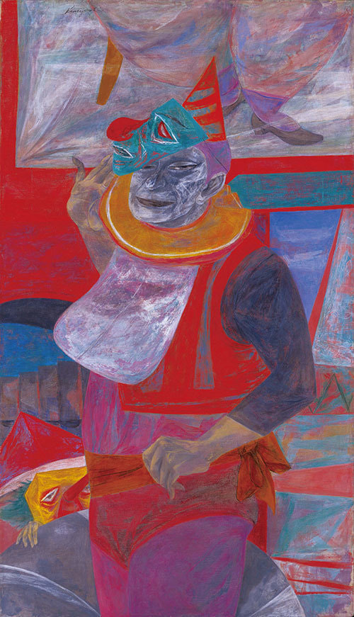 ヴェールのように透けた色が、パレットナイフで何層にも重ねられた画面からは、それが例え油彩画であっても、カゼインのように乾いていながら、絵自体が発光しているかのような印象を受けます。そして、そうした色たちを背負って立つのは、サーカスの道化師です。国吉の心に、どんな心境の変化があったのでしょうか。